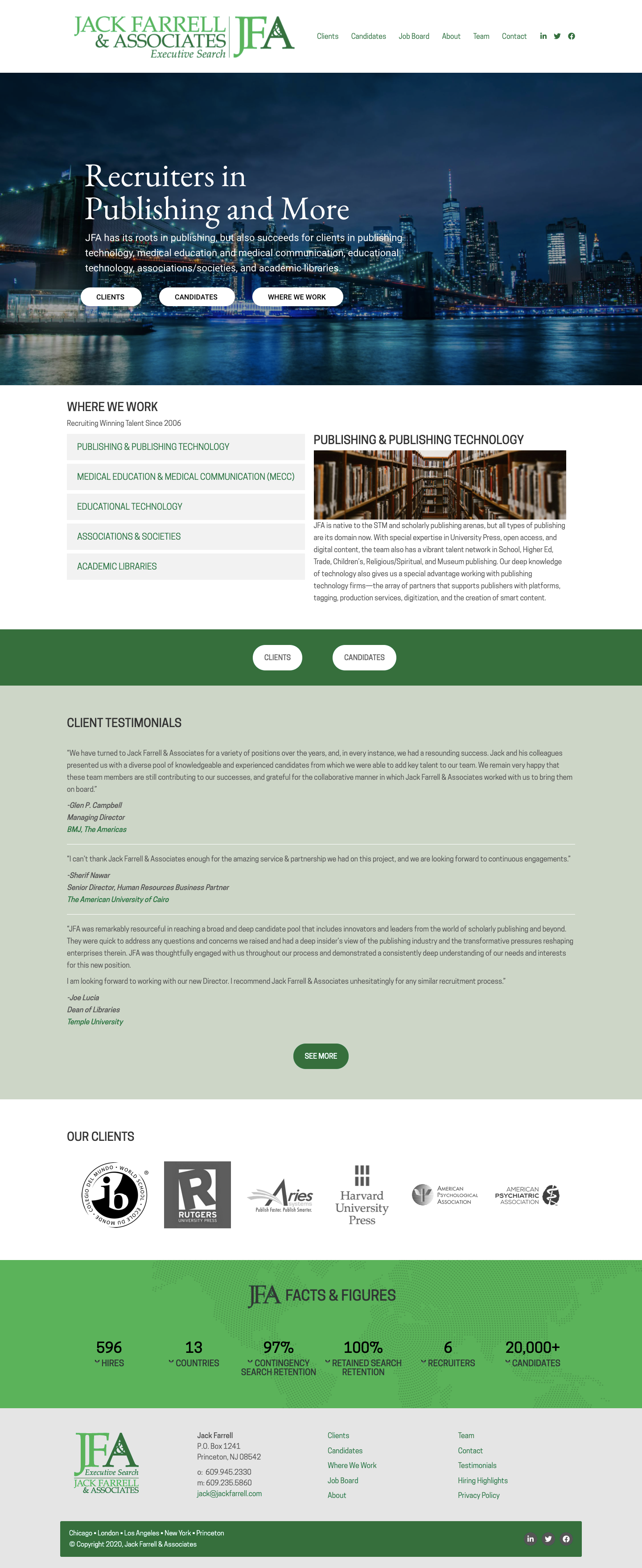 Jack Farrell & Associates hired me to redesign their Executive Search company logo back in 2013. In 2020 I was asked to redesign their website to help the company attract more clients and candidates. The result was a success, see Jack’s testimonial here. 2013-present.